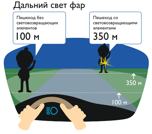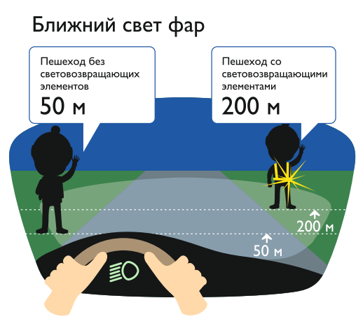 При движении с ближним светом фар водитель автомобиля способен увидеть пешехода на дороге на расстоянии 25-50 метров. Если пешеход применяет световозвращатель, то это расстояние увеличивается до 150-200 метров. А при движении автомобиля с дальним светом фар дистанция, на которой пешеход становится виден, с применением световозвращателей увеличивается со 100 метров до 350 метров. Это даёт водителю 15-25 секунд для принятия решения. В соответствии с постановлением Правительства Российской Федерации от 14.11.2014 № 1197 с 1 июля 2015 года вступили в силу изменения в Правила дорожного движения Российской Федерации (далее – Правила). Согласно новой редакции Правил с 1 июля 2015 года, при переходе дороги и движении по обочинам или краю проезжей части в темное время суток или в условиях недостаточной видимости пешеходам рекомендуется, а вне населенных пунктов пешеходы обязаны иметь при себе предметы со световозвращающими элементами и обеспечивать видимость этих предметов водителями транспортных средств. |